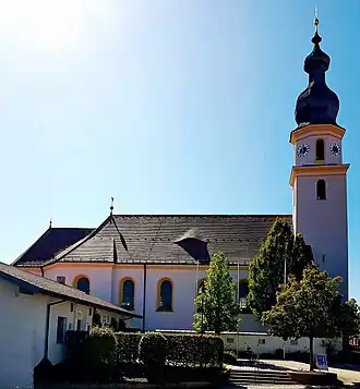 Die neobarocke Saalkirche wurde 1914–15 nach einem Entwurf von Joseph Elsner junior errichtet. Sie besteht aus dem Langhaus, dem eingezogenen Chor mit Fünfachtelschluss im Osten, der Sakristei an der Südwand des Chors und dem aus der Längsachse nach Norden verschobenen Kirchturm auf quadratischem Grundriss im Westen, der vom gotischen Vorgängerbau aus der zweiten Hälfte des 15. Jahrhunderts übernommen wurde. Er erhielt im Barock sein achteckiges Obergeschoss mit der abschließenden Welschen Haube. Im Turm sind der Glockenstuhl und die Turmuhr untergebracht.