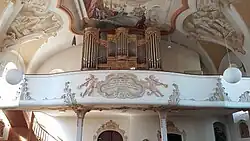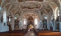 Der Innenraum des Langhauses ist mit einem Tonnengewölbe überspannt. Das Bildnis des heiligen Sebastian malte 1771 Johann Michael Greiter.