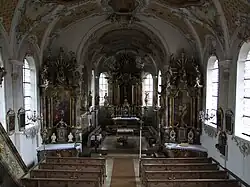 Die Fresken im Innenraum, der mit einem Stichkappengewölbe überspannt ist, schuf 1763 Franz Anton Zeiller. Der Hochaltar wurde 1766 aufgestellt. Den Kreuzweg hat 1754 Franz Xaver Bernhard ursprünglich für die Pfarrkirche in Rieden bei Kaufbeuren gestaltet. Eine um 1700 entstandene Pietà stand ursprünglich in einer Kapelle von Baisweil, die abgebrochen wurde.