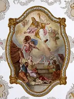- Im zweiten Fresko des Chores kniet Benedikt von Nursia vor der Dreifaltigkeit. Seine Attribute, Buch, Abtsmitra und -stab, werden von Engeln gehalten.
