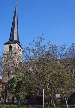 Die Kirche geht auf einen mittelalterlichen Bau zurück. Aus dieser Zeit stammt noch der heutige Kirchturm, dessen Fundamente auf die Zeit um 1200 datiert werden. Nach einem Verfall des Gebäudes erfolgte eine weitgehende Neuerrichtung, die 1418 abgeschlossen wurde. Dieser Vorgängerbau wurde im 17. Jahrhundert umgebaut. So stammen große Teile des quadratischen Turms, so das Glockengeschoss und die schlanke Spitze des Turms aus dem Jahr 1616[1] oder 1617[2]. Von 1901 bis 1906 erfolgte dann der weitgehende Neubau des heutigen Kirchenschiffs. Die einschiffige Kirche wurde wie eine Wandpfeilerkirche angelegt. Die Kirche stellte jeweils die Pfarrkirche und Zentrum des Ortes dar.