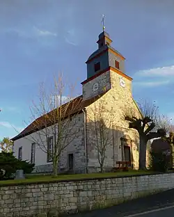 Das bis auf die Ecksteine verputzte Kirchenschiff ist aus Bruchsteinen gebaut. Ihm ist im Westen in Breite des Kirchenschiffs ein dreiteiliger Baukörper vorgelagert, der das mit Pilastern und Bekrönung eingerahmte Portal in einer repräsentativen Fassade enthält. Aus dem Satteldach des Kirchenschiffs erhebt sich der Dachturm, über dessen steinerne Geschosse ein weiteres, schiefergedecktes, mit einer Haube und einer Laterne bedecktes, aufgesetzt wurde. Hinter dessen Klangarkaden befindet sich der Glockenstuhl, in dem drei Kirchenglocken hängen.