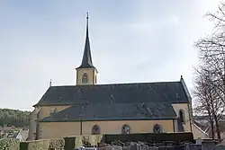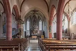 Die heutige dreischiffige Pseudobasilika ist im Laufe mehrerer Jahrhunderte entstanden. Die ältesten Teile sind die unteren Geschosse des Kirchturms, die um 1100 gebaut wurden. Der Bau des eingezogenen, polygonal abgeschlossenen Chors, dessen Wände von Strebepfeilern gestützt werden, ist auf das 14. Jahrhundert zu datieren. Das Langhaus wurde zwischen 1902 und 1903 erneuert und dabei auf die Höhe des Chors gebracht. Es hatte zunächst nur ein rechtes Seitenschiff, das erst 1952 auf die heutige Länge gebracht wurde. 1602 wurde der Chorflankenturm an der Südwand des Chors aufgestockt und mit einem Knickhelm bedeckt. Zwischen 1730 und 1760 wurde die Kirchenausstattung errichtet, die allerdings 1902/03 weitgehend durch eine neugotische ersetzt wurde. Erhalten blieb jedoch ein dem Maternus geweihter Altar, der 1750 in der Werkstatt des Johann Wolfgang van der Auwera entstanden ist. Er steht in einer Kapelle, die einige Jahre vorher an den Turmdurchgang angebaut wurde. In einer Kapelle neben dem Chor steht ein 1759 gebauter Altar von Johann Peter Wagner, der der Mater Dolorosa geweiht ist.