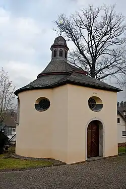 Die ehemalige Wallfahrtskapelle ist ein ovaler Zentralbau mit abgestuftem Zeltdach und einer Laterne. Sie wurde 1734 errichtet. Über dem Hauptraum, dem Vorraum und dem flachbogig geschlossenen Chor wurde eine Volutendecke eingezogen.