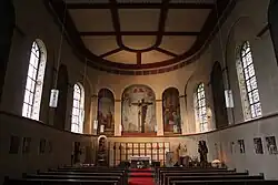 Der flach gedeckte Saal im Inneren ist hell verputzt und wiederholt die Wandgliederung des Außenbaus. Die Decke ist durch dunkel gestrichene, von Ornamenten verzierten Balken in große Felder geteilt. Die zwei Arkaden links und rechts des Altars sind mit Gemälden im Stil der Nazarener 1907 vom Maler M. Adler ausgemalt. In der mittleren Nische sind Reste der Erstausmalung Lasinskys 1981 freigelegt worden. In den beiden Apsisfenstern sind je ein spätgotisches Glasfenster mit Darstellungen von Johannes dem Täufer und der Kreuzigung, die von Lassaulx und seiner Frau gestiftet wurden, eingebaut.