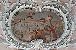 Der Stuck mit Akanthusornamenten wurde von Michael Stiller gefertigt (1708). Die Deckenbilder wurden um 1733 von einem unbekannten Künstler geschaffen. Das im Langhaus zeigt die Himmelfahrt Mariens, das im Chor die Bekehrung des Saulus. An der linken und rechten Seitenwand sind Wappen von Kurfürst Karl Albrecht und Bischof Alexander Sigismund von der Pfalz, an der Decke über der Empore Gemälde des Kurfürsten mit Gemahlin und des Bischofs mit Gefolge.[1][5]