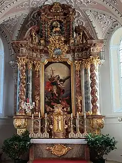 Der Hochaltar wurde 1714 vom Schreiner Ferdinand Amtmann aus Urspring gefertigt und von Bonaventura Stapf marmoriert und vergoldet. Das im selben Jahr von Paul Zeiller geschaffene Altarbild zeigt den Erzengel Michael als Bezwinger Satans. Die Seitenaltäre wurden um 1725 angefertigt, ihre Fassung ist ebenfalls von Bonaventura Stapf. Ihre Altarbilder zeigen die hl. Anna und den hl. Stephanus (1862). Die Kanzel stammt ungefähr aus dem Jahr 1720.[1][5]