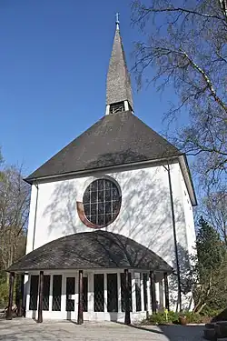 Erst nach Kriegsende wurden die Planungen wieder aufgenommen und am 23. Oktober 1954 der Grundstein der heutigen Kirche gelegt. Bis 1955 errichtete man unter der Leitung von Gerhard Langmaack das heutige Gebäude mit Platz für 254 Personen. Es sollte sich einerseits in den vorhandenen Baumbestand der Umgebung einfügen und sich andererseits wirkungsvoll davon abheben. Am 29. September 1955 wurde die Kirche geweiht und entwickelte sich in den folgenden Jahren zum Mittelpunkt einer Gemeinde die seit dem 1. Oktober 1964 selbständig ist.