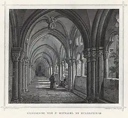 Von den umfangreichen Anlage des mittelalterlichen Michaelisklosters ist lediglich ein Teil des westlichen Flügel des Kreuzgangs aus dem 13. Jahrhundert vor dem nordwestlichen Querhaus erhalten. Er ist Teil des Welterbes. Nach Angaben des Niedersächsischen Landesamtes für Denkmalpflege belegt der Kreuzgangflügel „den architektonischen Wandel und die steinmetztechnische Entwicklung von der strengen und schlichten Formgebung der frühromanischen Bildhauerkunst hin zu den ungleich aufwändigeren Steinmetzarbeiten in der Mitte des 13. Jahrhunderts. Profilierte Pfeiler und Wandvorlagen gliedern den Raum. Basen, Kapitelle und Kämpfer verstärken die räumlich-plastische Wirkung, spitzbogige Gewölbegurte sowie figürlich und vegetabil geschmückte Schlusssteine schmücken die Gewölbeabschlüsse.“[44]