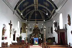 Im Innenraum hat sich eine reichhaltige historische Ausstattung erhalten. Besonders zu erwähnen sind der Hochaltar in Formen des Rokoko aus dem 18. Jahrhundert, der Beichtstuhl aus gleicher Zeit und der aus Blaustein gefertigte Taufstein, ebenfalls 18. Jahrhundert. Die Buntglasfenster sind Werkstattentwürfe aus dem Jahr 1900.[2]