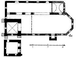 Das Langhaus wurde im Kern im 11. Jahrhundert errichtet und später ein nördliches Seitenschiff angefügt. 1170 wurden der reich verzierte Westturm mit Rhombenhelm und ein dreiseitig geschlossener Chor angefügt. 1690 und 1722 fanden Wiederherstellungsarbeiten an der Kirche statt, in deren Zug Chor und Sakristei neu errichtet wurden. 1906 wurde das Seitenschiff abgebrochen.
