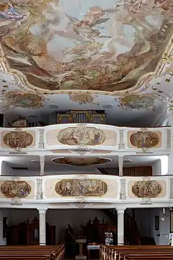 Die Fresken wurden im gleichen Jahr von Johann Anwander aus Lauingen ausgeführt. Auf dem Chorfresko wird der Triumph der katholischen Eucharistielehre über die Lehren der Reformation versinnbildlicht. Ein offenes Buch auf einem Altar wird von den Evangelistensymbolen Löwe, geflügelter Mensch, Stier und Adler umgeben, darüber schweben ein Kelch und eine Monstranz. Am Obelisk befindet sich ein Porträt des Augsburger Fürstbischofs Johann Christoph von Freyberg. Daneben kniet ein Papst. Zwei weibliche Figuren, eine hält ein Bild mit der Unterschrift Seelen Ablas in der Hand, verweisen auf die Erlösung vom Fegefeuer durch den Ablass. Am unteren Bildrand sieht man links eine Weltkugel mit den personifizierten Darstellungen der vier Erdteile. Rechts daneben stürzen Häretiker in den Abgrund. Die vier Grisaillen symbolisieren die theologischen Tugenden Glaube, Hoffnung, Liebe und die Ecclesia, die Kirche.