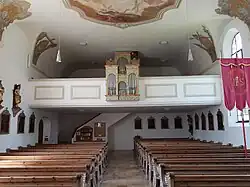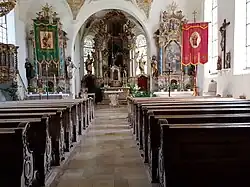 Die an der Nordwand befindliche hochbarocke Kanzel (2. Hälfte 17. Jh.) erfuhr in den Jahren 1755–56 eine Überarbeitung im Rokokostil. Die Deckenfresken Marienkrönung mit Aposteln im Langhaus und Erzengel Michael als Heerführer der Engel sowie die Kirchenväter im Chor stammen ebenfalls von Johann B. Ramis und wurden 1756 angefertigt. An der Südwand steht ein von Johann Luidl um 1720/30 angefertigter Geißelheiland neben einer Sebastiansfigur. Unter der Empore hängen Kreuzwegbilder und dazwischen ein Johann Nepomuk (jeweils 19. Jahrhundert?).