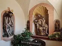In zwei Nischen im Vorzeichen stehen die ausdrucksstarken Darstellungen des Jesus in der Rast und einer Pietà, die von außergewöhnlicher Qualität sind und aus dem 17. Jahrhundert stammen.