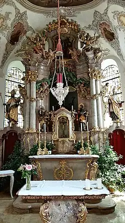 Im von Joseph Fischer 1757 gefertigten Stuckmarmor-Hochaltar befinden sich die von Thomas Seitz stammenden Skulpturen der Heiligen Michael, Petrus und Paulus. Über den seitlichen Portalen stehen die Heiligenfiguren Wolfgang und Norbert und im Auszug Erzengel Michael als Seelenwäger.