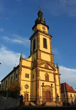 1306 wurde die Pfarrkirche zum ersten Mal urkundlich erwähnt. Im Jahr 1463 wurde die Kirche im Ersten Markgrafenkrieg zerstört. Als Nachfolgebau wurde ab 1464 eine spätgotische Hallenkirche errichtet. Im Zweiten Markgrafenkrieg brannte sie infolge von Brandstiftung teilweise aus. Nach dem Wiederaufbau wurde die Kirche im Dreißigjährigen Krieg wiederum gänzlich zerstört.