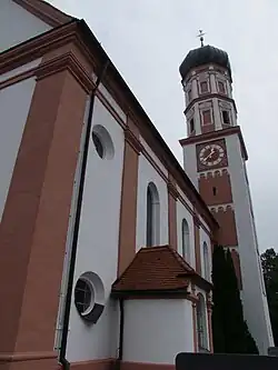 Die Kirche gehörte früher zum Kloster Steingaden. Ritter Johann von Löwenthal stiftete 1245 einen Jahrtag. Das untere Teil des Turmes stammt noch aus dem 15. Jahrhundert. Nachdem die alte Kirche 1694 baufällig geworden war, ließ angeblich Herzog Maximilian Philipp von Bayern von seinem Baumeister Echter Pläne für einen Neubau anfertigen. Das Turmoktogon erbauten die Baumeister Thomas Natterer und Georg Miller aus Mindelheim. Der Neubau des Langhauses und des Chors wurde 1701 ausgeführt, nachdem 1700 ein Konsens zum Neubau erzielt worden war. Der Bau enthält typische Stilelemente von Thomas Natterer, der in der Umgebung mehrere Kirchen baute. Am 28. April 1701 war die Grundsteinlegung, belegt durch einen Inschriftenstein neben dem Eingang. Die Weihe der Kirche durch den Weihbischof Johannes Eustache Egolf von Westernach fand am 19. Januar 1704 statt. Von ihm befindet sich an der Westwand des Chores ein Gemälde. Der Innenausbau zog sich noch über mehrere Jahre hin. Die Gemälde an der Empore stammen aus dem Jahre 1717, das Kirchengestühl wurde 1719 angefertigt. Der Apostelzyklus wurde 1721 gekauft. Die Kanzel sowie die Seitenaltäre sind aus dem dritten Viertel des 18. Jahrhunderts. Im späten 18. Jahrhundert wurde eine neue Decke eingezogen, das Fresko ist mit 1793 datiert. Der Hochaltar wurde 1825 angeschafft. Renovierungen fanden 1870, 1922 bis 1923 statt, außen wurde die Kirche 1952 und 2016 renoviert.