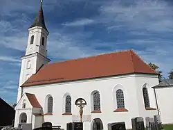 Auf der Westseite ist ein leicht in das Langhaus einspringender Turm angebaut. Dieser besitzt einen Spitzhelm und ist mit der Jahreszahl 1908 bezeichnet. Er wurde jedoch bereits 1772 von dem Erdinger Baumeister Johann Baptist Lethner errichtet. Der viergeschossige Unterbau über quadratischem Grundriss ist mit Putzbändern verziert und enthält zahlreiche rundbogige Blendnischen mit schmalen Lichtschlitzen. Der Oberbau, der den Glockenstuhl und allseitige rundbogige Schallöffnungen enthält, ist an den Kanten abgeschrägt und dort mit kurzen Pilasterstücken verziert. Den oberen Abschluss bildet ein verkröpfter, schindelgedeckter Spitzhelm mit Turmkugel und Doppelkreuz.[2]