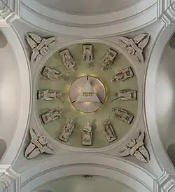 Im Zentrum der Kuppel steht der hebräische Gottesname, das Tetragramm, im Dreieck der Dreifaltigkeit und im Kreis der Vollkommenheit. Er ist umringt von zwölf Männern, die auf Thronen sitzen und Harfen tragen. In den vier Pendentifs darunter befinden sich die vier Evangelistensymbole. Die Darstellung kombiniert Offb 4,1–11 mit Offb 15,2–3 .[6] Die Zahl der 24 Ältesten ergibt sich als Summe der Zwölf in der Kuppel mit den Zwölf in der Apsis.