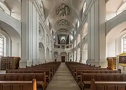 Das Deckengewölbe des Langhauses trägt drei ovale Bildmedaillons von 4,2 × 5,2 m Größe. Sie zeigen von hinten nach vorn