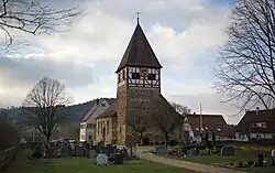 Die Dorfkirche stammt aus dem ersten Viertel des 13. Jahrhunderts. Die erste Erwähnung der Chorturmkirche ist 1408 nachweisbar, bereits 1358 wird jedoch die Pfarrei genannt. Am 7. August 1413 ging durch Hermann Vyerabend das Patronat an das Gmünder Spital über.