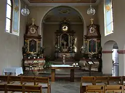 An der östlichen Chorwand der alten Kirche befindet sich ein barocker Hauptaltar, der von zwei ebenfalls barocken Seitenaltären flankiert wird. Der Hauptaltar wurde 1748 geweiht, die Seitenaltäre sind wohl ebenso alt. Der Hauptaltar ist dem hl. Michael geweiht, die Seitenaltäre Maria und Josef. Die Altargemälde zeigen die jeweiligen Heiligen in Ölgemälden von Johann Georg Binder, dessen Werkstatt für die Herstellung aller drei Barockaltäre und ihres Bild- und Figurenschmucks in Betracht kommt. Die Altäre waren ursprünglich schmuckvoller, doch ging ein Teil des Zierrats schon bei Restaurierungen um 1823 verloren. Auch ihre Farbfassung wurde mehrfach verändert, wobei zuletzt wieder die ursprüngliche blau-rot-goldene Marmorierung hergestellt wurde.