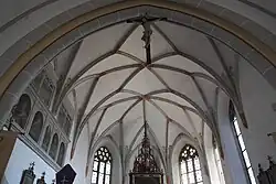 Der Innenraum des Langhauses ist mit einem Stichkappengewölbe überspannt, der des Chors mit einem Sterngewölbe. Das Chorgestühl wurde von Jörg Syrlin dem Jüngeren gebaut. Die Orgel wurde 1862 von Ferdinand Benz gebaut.