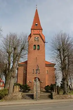 Der zunächst stehengebliebene alte Findlingsturm wurde 1907 durch den heutigen Turmanbau an der Südseite ersetzt. Der Kirchturm wurde von dem Architekten Wilhelm Matthies entworfen und hat eine Höhe von 42 Metern.[1] Der neue Turm kostete 22.000 Mark und wurde von Pastor Bruno Theodor Haentzsche eingeweiht. Die Wetterfahne mit der Jahreszahl 1702 wurde oben auf den neuen Turm gesetzt.