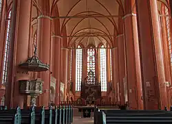 Bei der Kirche handelt es sich um eine Hallenkirche aus Backsteinen. Sie besitzt sechs Joche und einen 5/10 Chorschluss mit Halbjoch und ist 52,58 Meter lang. Die Kirche ist 26,29 Meter breit, die größte Innenhöhe beträgt 20,45 Meter. Die Hanglage erforderte im Osten starke Substruktionsbauten, welche in Form einer Unterkirche ausgeführt sind. Im Westen schließt der 79,00 Meter hohe Kirchturm an das Bauwerk.
