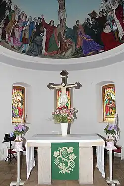 Das Apsisbild im Stil der Nazarener zeigt die Kreuzigung Christi mit Johannes und den drei Marien in Gesellschaft von Königen, Fürsten, deren Frauen, Geistlichen und anderen Honoratioren. Das Bild von 1886 wurde 1975 überstrichen und 1997 wieder freigelegt.