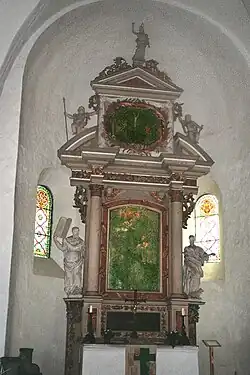 Das Hauptstück der Ausstattung bildet ein hölzerner Altaraufsatz aus dem Jahr 1699. Er besteht aus einem hohen zweigeschossigen Säulenaufbau mit Gemälden, die das Abendmahl, im Hauptbild Gethsemane und im Aufsatz die Kreuzigung darstellen.