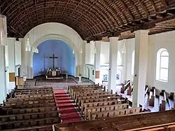 Der Altar ist ein schlichter hölzerner Tisch, mit einem Altartuch geschmückt. Auf dem Altartisch steht ein großes Kreuz aus Naturholz. Der Altar selbst steht mittig in der um drei Stufen erhöhten Halbrundapsis. Zwischen dem Triumphbogen und der jeweils zweiten Säule sind beiderseits zu den Wänden hin kleine quadratische Räume abgetrennt. Unmittelbar vor dem Kirchenschiff befindet sich auf dem Podest eine holzverkleidete niedrige Kanzel.[15]