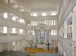 Der wohlproportionierte helle Kirchenraum ist durch die bis an die Decke reichenden Stützen der dreigeschossigen Emporen in drei Schiffe unterteilt. Obwohl sich die Emporen an allen vier Seiten erstrecken, reicht die Muldendecke des Mittelschiffs bis an die Stirnwände. Die Seitenschiffe sind flachgedeckt. Hinter dem Altar belden untere und mittlere Empore Logen, mit Verglasung zum Mittelschiff und Begrenzung durch Seitenwände. Auch die Erdgeschosse der Seitenschiffe sind in dieser Weise abgegrenzt. Unterhalb der Orgel ist die untere Empore verglast aber nicht seitlich abgetrennt. Sie und die Orgelempore ragen bogenförmig vor, ihre Stützen reichen nur vom Boden bis an die Orgelempore.
