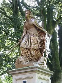 Direkt gegenüber dem Hauptportal befindet sich ein monumentales Denkmal zum Gedenken an die Gefallenen im Deutsch-Französischen Krieg 1870/71. Auf einem Sockel steht die vom bekannten klassizistischen Bildhauer Johannes Janda, (Schüler von Daniel Rauch) geschaffene Figur der Germania, der Personifikation Deutschlands, die in deutlich kriegerischer Pose dargestellt wird. In den siebziger Jahren wurden das Schwert und der Schild gewaltsam abmontiert, sind später aber auf dem Dachboden der Friedhofskapelle wiederaufgefunden worden. Vor kurzem wurde die gesamte Statue nun restauriert und die Germania erhielt ihre Attribute zurück.