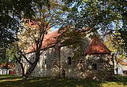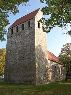 Die romanische Kirche entstand im 12. Jahrhundert als vollständige Anlage aus Bruchsteinen. Das Kirchenschiff wird nach Osten durch einen eingezogenen Chor und eine halbkreisförmige Apsis abgeschlossen. An der Westseite des Schiffs befindet sich der auf querrechteckigem Grundriss Ende des 12. Jahrhunderts/Anfang des 13. Jahrhunderts errichtete Kirchturm. Der Turm ist dabei etwas breiter als das Kirchenschiff. Er wird von einem Satteldach bedeckt. Heute im Glockengeschoss vorhandene Öffnungen wurden erst später eingefügt. Die Mauerstärke des Turms beträgt 1,70 Meter, die des Schiffs 1,00 Meter.