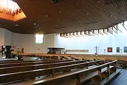 Architekt Walter Moser betont die zentrale Bedeutung des Altarraums für den ganzen Kirchenbau, indem der Besucher über Rampen zur erhöht gebauten Kirche emporgeht und im Kirchenraum auf Bänken sitzt, die halbkreisförmig um den Altarraum angeordnet sind. Mit dieser Raumkonzeption nimmt die Kirche die Vorgaben der Liturgiekonstitution des Zweiten Vatikanischen Konzils auf, das die tätige Teilnahme der Gläubigen an der Gottesdienstfeier gefordert hatte. Durch den polygonalen Kirchenraum, der auf den Altar ausgerichtet ist, befinden sich die Gläubigen in der Nähe des Altars und können unmittelbar am liturgischen Geschehen teilnehmen. Die Lichtführung der Kirche betont die Bedeutung des Altarraumes.