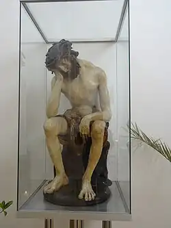 Die spätgotische Ausstattung sowie die spätere barocke und neugotische Ausstattung der Kirche sind größtenteils verlorengegangen. Heute ziert ein großes Kreuz des Bildhauers Christian Jorhan d. Ä. von 1779 den Hochaltar. Das bedeutendste Kunstwerk der Kirche in jedoch die lebensgroße Holzskulptur Christus in der Rast von ca. 1523, gefertigt vom Landshuter Bildschnitzer Hans Leinberger.[3]