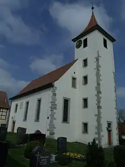 Der dreiachsige Saalbau mit Satteldach wurde an der Stelle eines Vorgängerbaus errichtet. Der fünfgeschossige Ostturm mit Turmuhr wird von einem geschweiften Pyramidendach abgeschlossen. Kirchenschiff und Turm besitzen eine verzahnte Eckquaderung. Die rechteckigen Fenster und das Portal weisen eine Hausteinrahmung auf, ebenso die Tür zur Sakristei. Rechts oberhalb des Portals ist eine Sonnenuhr angebracht. Im Westen führt außen ein gedeckter Aufgang zur Empore.