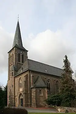 Neubau 1904 von J. Buchkremer aus Aachen; 2 – schiffige Backstein – Hallenkirche, höheres und breiteres Hauptschiff im Süden, durch Rundpfeiler mit Kapitellzone und spitzbogige Arkaden abgetrennt; eingestellter Nord – West – Eckturm, quadratischer Turm mit angebautem Treppentürmchen, 3 – geschossig in neugotischen Formen mit spitzer 8 – eckiger Haube. Kirchenbau in neugotischen Formen mit knappen Strebepfeilern und sparsamem Maßwerk, an der Südaußenwand eingesetzt Grabplatten des 16. bis 18. Jhs.; Chor mit 3/8 – Schluss; im Norden zeitgenössischer Sakristeianbau; gemeinsames Satteldach; Innenausstattung in guten neugotischen Formen mit Altären; Orgelprospekt neu, Orgelempore im Unterbau erneuert; Kreuzrippengewölbe auf Wandkonsolen, spitzbogige Schildbögen, im Chor eingebaut gotische Sakramentsnische mit originalem Gitter, im Eingangsjoch eingemauert Rest eines römischen Matronensteins, im Chor Hieronymusbild des 16. Jhs.; Fußboden und Chorfenster neu; zugehörig: Kirchhof mit neu aufgestellten Grabsteinen des 17. und 18. Jhs. überwiegend Blaustein; Friedhofsbereich geschützt von Bruchsteinmauer mit eingesetztem Grabkreuz des 16. Jhs.[6]