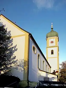 Die im Kern spätgotische Saalkirche wurde 1698 bis 1701 barock umgestaltet. Sie besteht aus dem im 19. Jahrhundert nach Westen verlängerten Langhaus, dem eingezogenen, dreiseitig geschlossenen Chor im Osten und dem 36 Meter hohen Chorflankenturm auf quadratischem Grundriss an der Südwand des Chors. Sein oberstes quadratisches Geschoss enthält den Glockenstuhl mit vier Glocken, das Geschoss darüber mit abgeschrägten Ecken die Turmuhr. Darauf sitzt eine Zwiebelhaube.