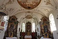 Den Stuck im Innenraum des Chors legte um 1754 Franz Xaver Schmuzer an. Die 1795 von Johann Baptist Anwander gestalteten Deckenmalereien zeigen im Chor Jesus Christus und Maria sowie im Langhaus Nikolaus von Myra als Schirmherr der Kranken.