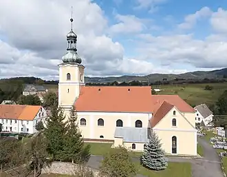 Die Kirche ist 1380 erstmals erwähnt[1], der heutige Bau stammt aus dem 16. Jahrhundert.[2] Zwischen 1588 und 1623 war die Kirche eine evangelische Kirche[2], in Folge der Besetzung der Grafschaft durch kaiserliche Truppen nach 1623 eine katholische Kirche. 1777 wurde die Kirche im spätbarocken Stil umgebaut, was am deutlichsten am Turm zu erkennen ist. Der Chor wurde vergrößert und durch beiderseitige Anbauten erweitert, die durch weitgespannte Bögen mit dem Chor verbunden wurden.