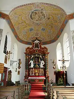 Über die frühere Kirche ist nichts bekannt. Als sicher gilt, dass beim Neubau 1730 Baumaterial der Vorgängerkirche verwendet wurde. Die Kirche wurde vom Kloster Rot an der Rot unter dem Abt Hermann Vogler erbaut. Zumindest das untere spätmittelalterliche Turmgeschoss wurde wiederverwendet.