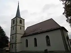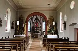 Das Langhaus besitzt drei Fensterachsen. Der Turm im Stil Julius Echters steht an der Nordseite, die große Sakristei wurde südlich angebaut. Der Drei-Achtel-Chor mit vier Fenstern (spitzbogig wie auch die Langhausfenster) befindet sich im Osten. Das mittlere Chorfenster ist in roter Farbe gehalten. Die Seitenaltäre im Stil des Rokoko (um 1750) stammen aus der abgerissenen Klosterkirche Bildhausen. Weitere Einrichtungsstücke von dort sind in Brünn (Altaraufsatz) und in Wegfurt (linker Seitenaltar) zu finden. Reliquienbehälter, Kanzel, Taufstein und Sakramentsnische sind nachgotisch und entstanden am Ende des 16. Jahrhunderts.