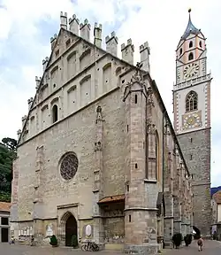Aufgrund des Wachstums von Meran (um 1291 bereits mit der heutigen Altstadt deckungsgleich) entschloss sich die Bürgerschaft zu einem Neubau der Kirche. Die Arbeiten zogen sich relativ lange hin. 1367 konnten Langhaus und Chor eingeweiht werden, an denen zuvor Steinmetzen der Rottweiler Bauhütte tätig waren; nach einer längeren Unterbrechung wurde nach 1438 von Stefan Tobler aus Burghausen das Langhaus eingewölbt. Die fertiggestellte Kirche wurde am 10. November 1465 eingeweiht. Der Turm mit den untersten beiden Stockwerken entstand gleichzeitig mit dem Chor noch im 14. Jahrhundert, während das dritte Stockwerk mit den gotischen Fenstern bis zur Einweihung der Kirche fertig war. 1545 setzte man das Turmviereck mit der Uhr darauf, die Turmhaube folgte bis 1618.