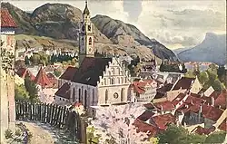 Die ehemalige Landeshauptstadt von Tirol, Meran, entwickelte sich aus einem mittelalterlichen Marktflecken zwischen dem Steilhang des Küchelberges im Norden und der Passer im Süden. Eine Kirche wird in diesem Bereich erst um 1266 erwähnt und war dem heiligen Nikolaus und dem erst kurz davor heiliggesprochenen Petrus Martyr geweiht. Sie gehörte zur älteren Pfarre Tirol und, da die Diözesangrenze an der Passer lag, nicht zum Erzbistum Trient, sondern bis 1816 zum Bistum Chur. Das Patronatsrecht der Pfarren Meran und Tirol besaß zunächst der jeweilige Bischof von Chur.[1]