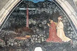 Unter dem Turm befindet sich ein Durchgang mit auf Blattwerkkonsolen und einer weiblichen Brustfigur ruhendem Kreuzgewölbe von 1360 bis 1370. Im Durchgang ist ein Wandgemälde des Meisters Wenzeslaus besonders beachtenswert, das eine Waldlandschaft mit zwei vor dem Kreuz des Ordens der Trinitarier knienden Männer zeigt, wohl die beiden Heiligen Johannes von Matha und Felix von Valois. Weitere Bilder zeigen eine Pietà von 1414 mit zwei Wappen, vielleicht ebenfalls eine Arbeit des Meisters Wenzeslaus, und eine Kreuzigung von 1460, die beide im 18. Jahrhundert erneuert wurden.