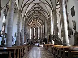 Der Kirchenraum selbst ist 52 Meter lang und 32 Meter breit. Zehn wuchtige Rundsäulen tragen das Netzgewölbe mit seinen kräftigen Rippen. Der Raum erweckt einen geschlossenen Eindruck, obwohl das nördliche Seitenschiff 6 Meter, das südliche hingegen nur 4 Meter breit ist, und das durch einen wenig betonten Triumphbogen getrennte Presbyterium leicht nach Norden geneigt ist. Der Chor ist 7 Meter lang und eine der besten Schöpfungen der Tiroler Hochgotik.