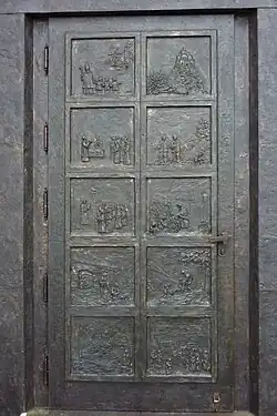 Das Portal, das 2007 aus Bronze gegossen wurde, zeigt auf der Außenseite Szenen aus dem Leben des heiligen Nikolaus und auf der Innenseite die Streckenführung des Nürburgrings, die Pfarrkirche St. Nikolaus, die Kapelle in Meuspath, das ehemalige Pfarrhaus und die Nürburg.