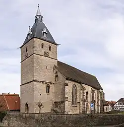 Das Gebäude steht auf dem gemauerten Plateau eines nach Norden abfallenden Geländes. Mit dem Bau der dreijochigen Halle aus Bruchsandstein mit Haupt- und Nebenchören im 5/8 Schluss wurde im 13. Jahrhundert mit der Halle im Westen begonnen. Um 1300 folgten die Ostjoche und die Chöre. Der Westturm aus Sandsteinquadern, mit Pyramidenhelm, wurde im 14. Jahrhundert errichtet. Der Hauptchor wurde nach einer Bezeichnung 1497 erweitert; es wurden beidseitig quadratische Sakristeigebäude angefügt. Das Mittelschiff wurde laut einer Bezeichnung im westlichen Schlussstein 1591 neu eingewölbt. Die Nordsakristei wurde 1969 erweitert. Von 1991 bis 1992 wurde der Innenraum umfangreich renoviert.